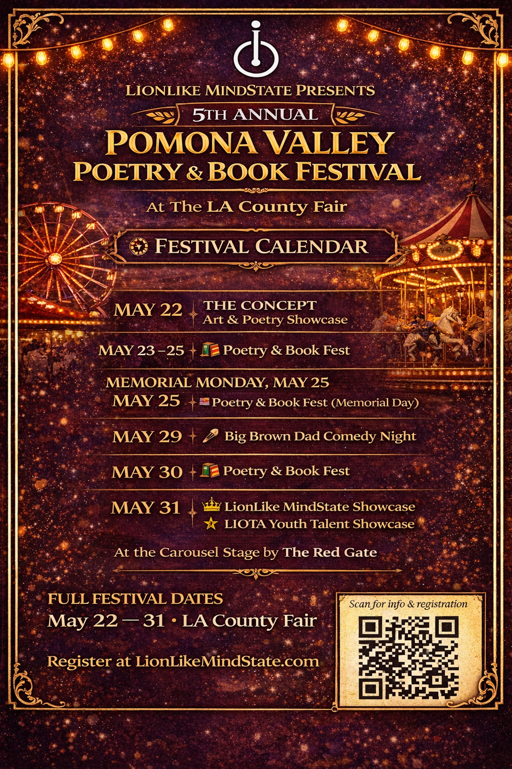 5th Annual Pomona Valley Poetry and Book Fest off with 20-25 Poets. Come Listen to each Poet INSPIRE for 12 Minutes at a Time and VISIT our Poets at the Author Row